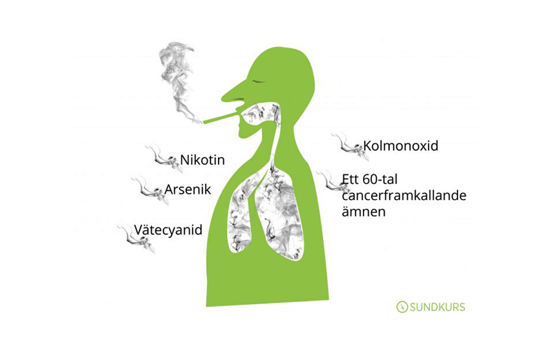 Förutom det beroendeframkallande nikotinet innehåller tobaken kolmonoxid som skadar hjärta och kärl samt giftiga substanser som vätecyanid, arsenik och ett 60-tal cancerframkallande ämnen. Det dagliga angreppet av giftiga halsbloss bryter ner kroppens försvar och skapar våra mest fruktade och dödliga folksjukdomar.